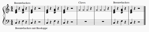 Die Klasse wird in drei Gruppen eingeteilt. Zwei Gruppen nehmen sich Boomwhackers in C-Dur und F-Dur. Die dritte Gruppe wählt Claves aus oder nimmt sich Instrumente, die kurz klingen.