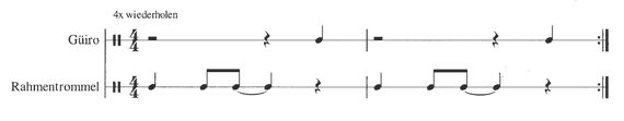 Die Strophe kann mit Rahmentrommel und einem weiteren Rhythmusinstrument wie z.B. dem Guiro, dem Schellenkranz oder der Cabasa begleitet werden. Rhythmisches Mitsprechen „Das scharfe ß, das scharfe ß, das … usw.“ hilft beim Erlernen der Phrase.