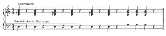 Für die Begleitung des Refrains braucht es lediglich zwei Gruppen. Die eine bekommt die Stäbe d, fis, a und das kleine c und die andere Gruppe erhält die Stäbe g, d und h. Der Grundton (Gruppe 1 das d und Gruppe 2 das g) wird jeweils mit einer Basskappe versehen.